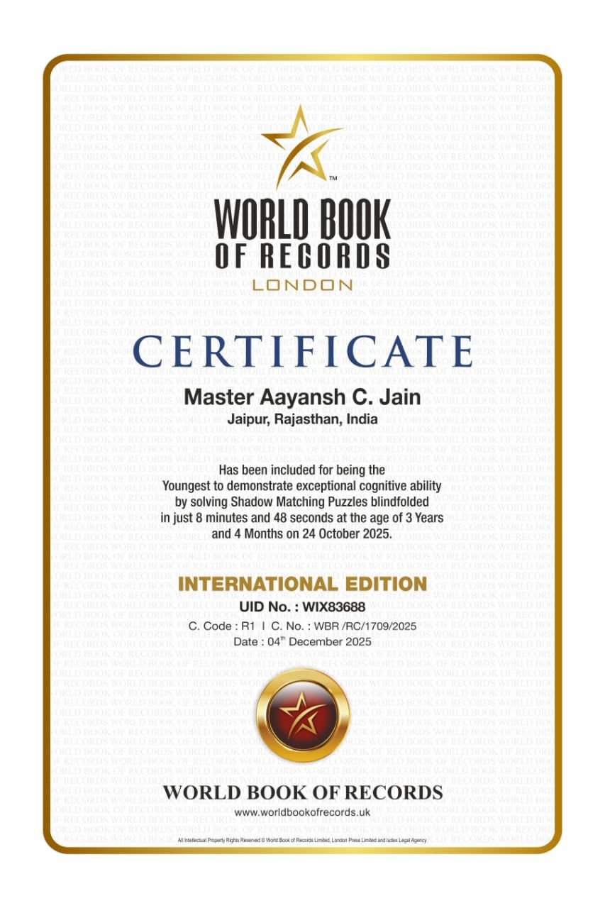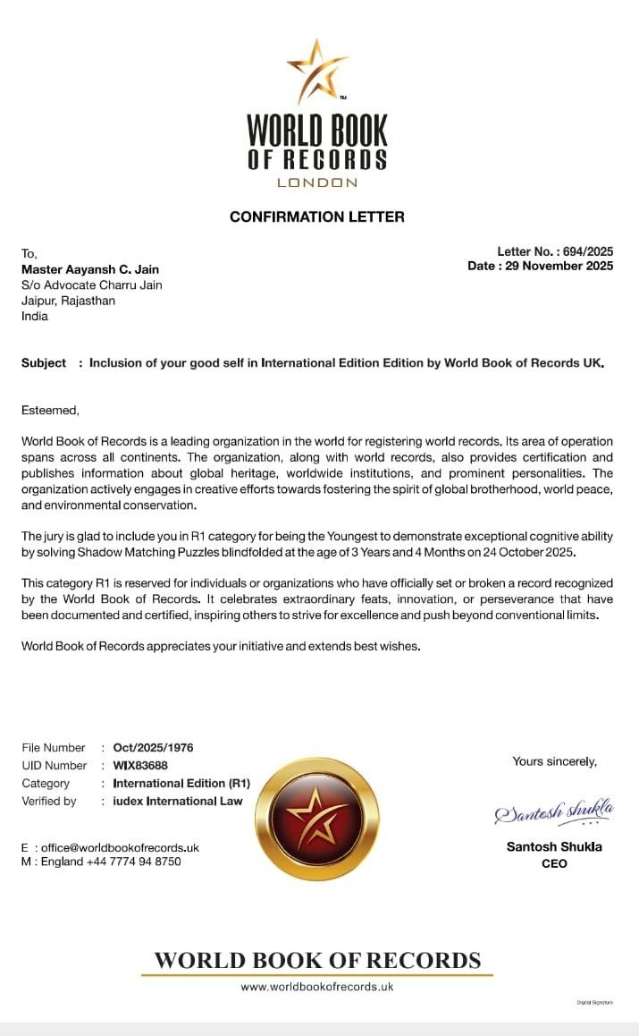 जयपुर निवासी मास्टर आयांश सी. जैन, पुत्र एडवोकेट चारू जैन, को वर्ल्ड बुक ऑफ रिकॉर्ड्स, लंदन द्वारा न केवल अंतरराष्ट्रीय रिकॉर्ड धारक के रूप में प्रमाणित किया गया है, बल्कि उन्हें ब्रिटेन की संसद (UK Parliament) के हाउस ऑफ कॉमन्स में होने वाले विशेष सम्मान समारोह और लंच के लिए आमंत्रित भी किया गया है.