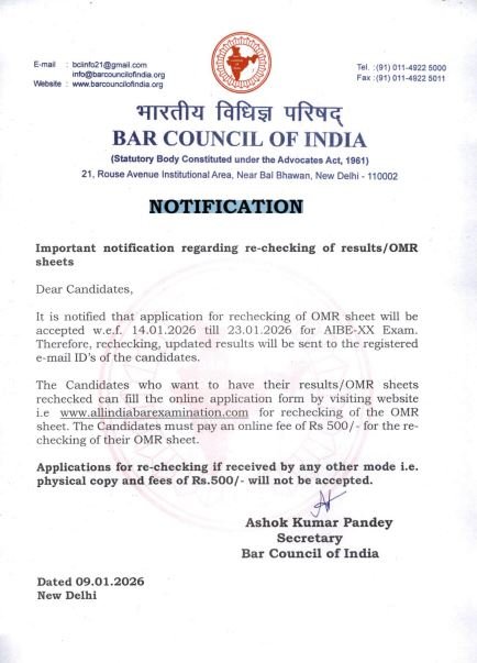 BCI की ओर से जारी नोटिफिकेशन के अनुसार, जो अभ्यर्थी अपने AIBE-20 परीक्षा परिणाम या OMR शीट की दोबारा जांच कराना चाहते हैं, वे 14 जनवरी 2026 से 23 जनवरी 2026 तक ऑनलाइन आवेदन कर सकते हैं।
