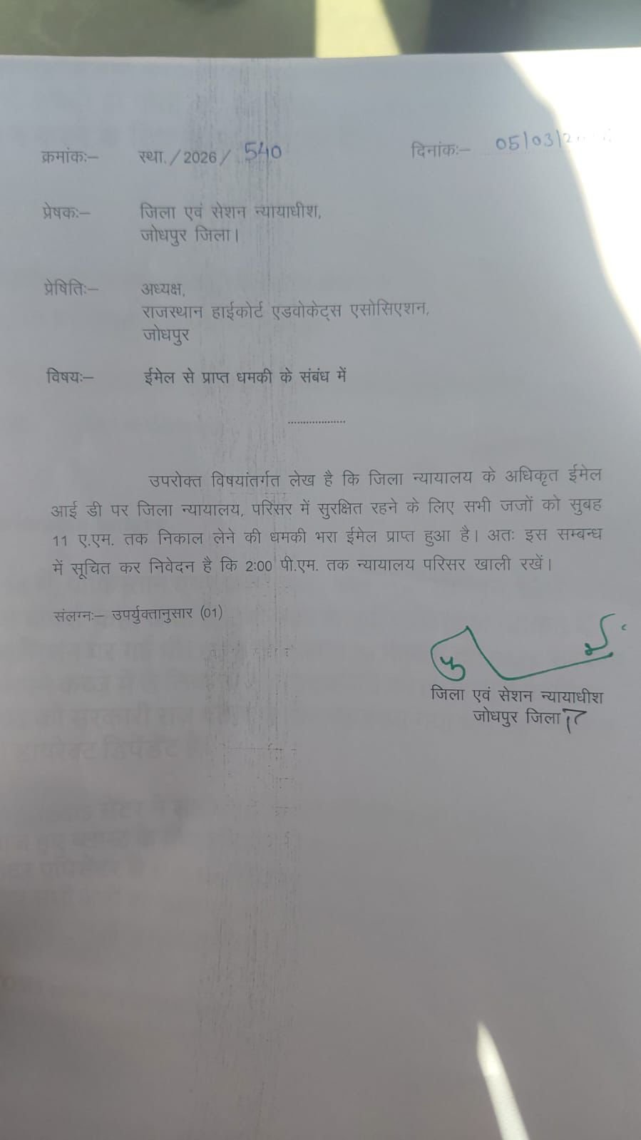 जिला एवं सत्र न्यायाधीश, जोधपुर को ई-मेल के जरिए कोर्ट परिसर को बम से उड़ाने की धमकी दी गई।