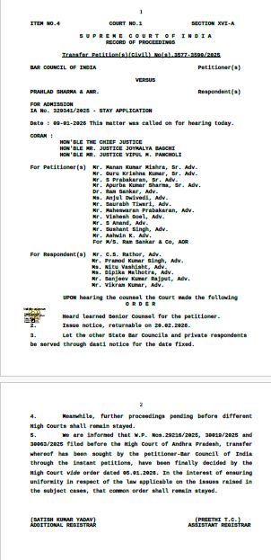 मंगलवार को यह मामला जस्टिस मनीष शर्मा की एकलपीठ में सूचीबद्ध था, सुनवाई शुरू होने के साथ ही बार काउंसिल ऑफ इंडिया की ओर से अधिवक्ता निखिलेश कटारा ने अदालत को सुप्रीम कोर्ट द्वारा पारित स्थगन आदेश पेश किया।