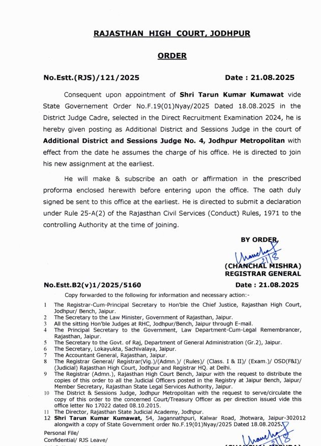 नवनियुक्त एडीजे तरुण कुमार कुमावत कि पोस्टिंग, जोधपुर महानगर में एडीजे संख्या 4 कोर्ट में जज नियुक्त August 22, 2025