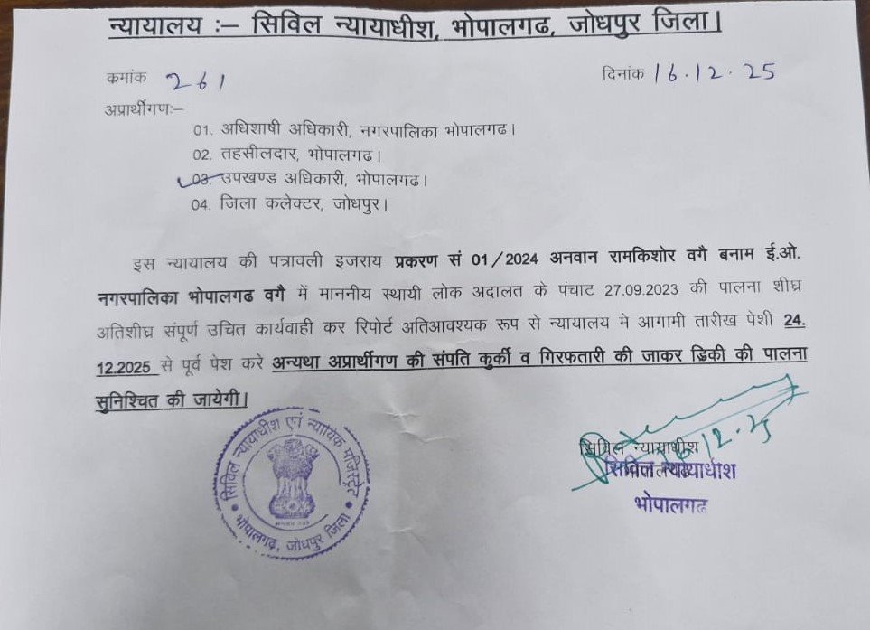 24 दिसंबर तक कोर्ट आदेश की पालना नहीं करने पर सरकारी दफतरों की संपत्ति की कुर्की और अधिकारियों की गिरफ्तारी की चेतावनी, सिविल न्यायालय ने जारी किए नोटिस