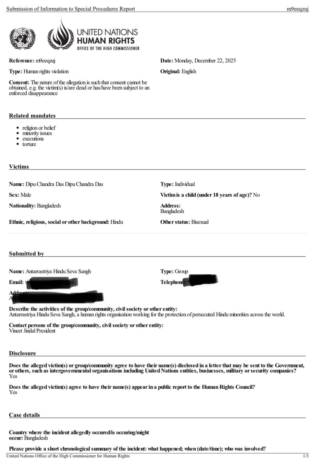 अंतरराष्ट्रीय हिंदू सेवा संघ के अध्यक्ष एवं अधिवक्ता विनीत जिंदल ने संयुक्त राष्ट्र से संबद्ध संस्था यूएनओ (UNOCHA) में औपचारिक शिकायत दर्ज कराई है।