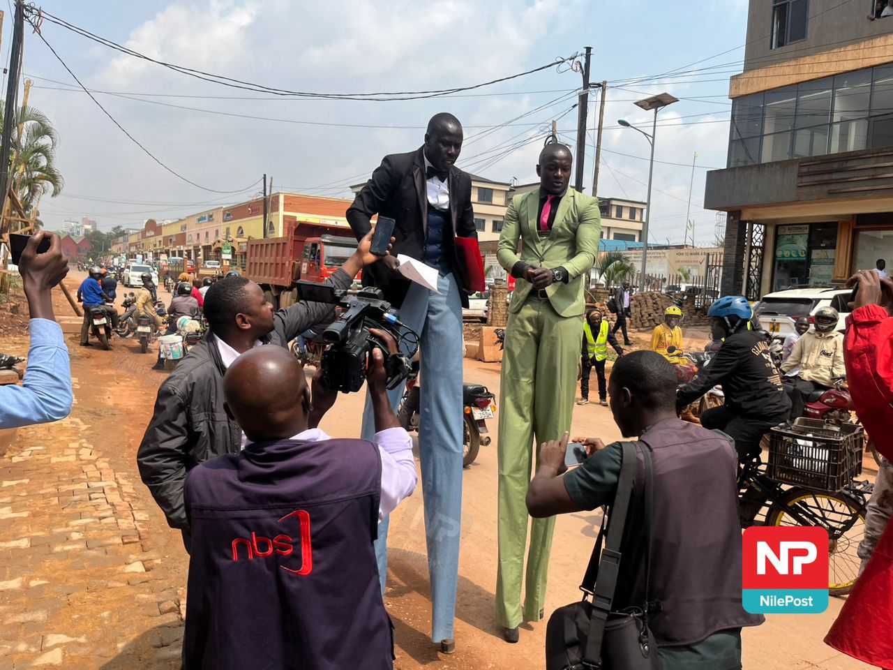 The duo’s dramatic arrival immediately drew crowds of onlookers and a flurry of camera phones, as journalists scrambled to capture the scene—some struggling to frame the full length of Katongole without cutting off his stilts.