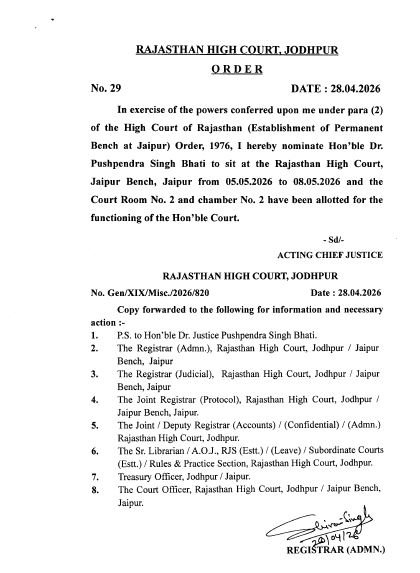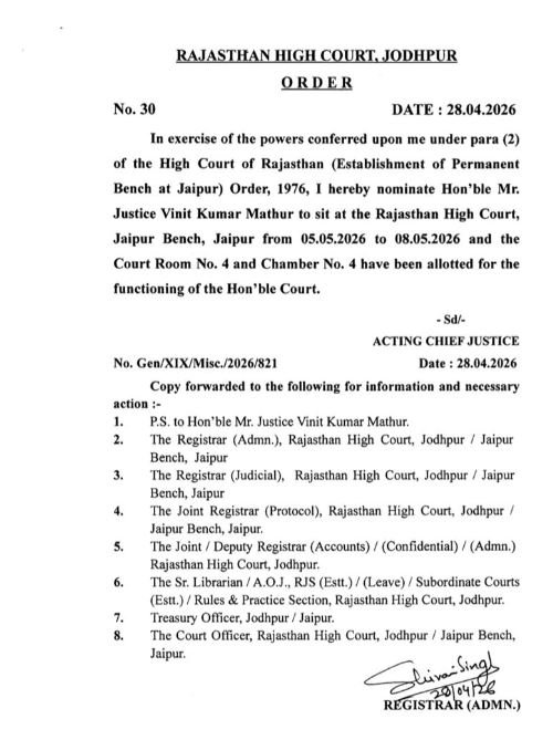 कार्यवाहक मुख्य न्यायाधीश ने 28 अप्रैल के एक आदेश के जरिए जस्टिस पी.एस. भाटी और जस्टिस वीनित माथुर को 5 से 8 मई तक जयपुर पीठ में सुनवाई के लिए नामित किया गया है।