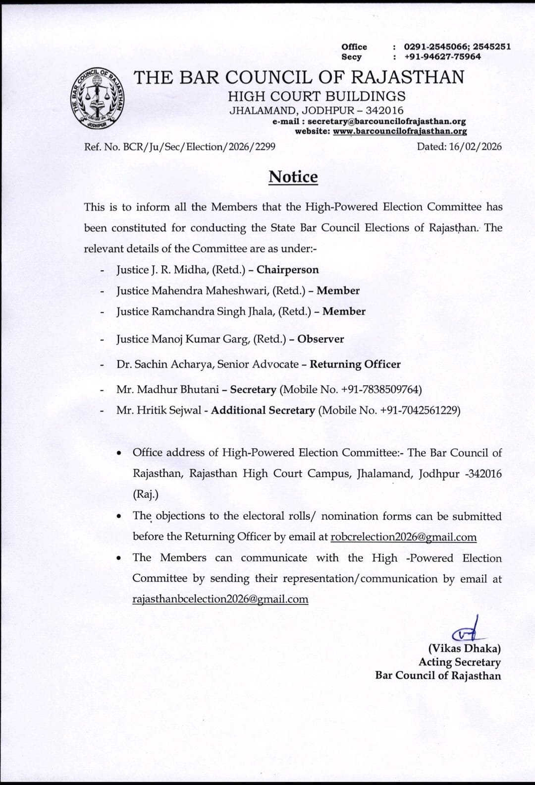 इसके अलावा बार काउंसिल के सदस्य चुनाव प्रक्रिया से संबंधित किसी भी अन्य सुझाव, प्रतिवेदन या जानकारी को समिति तक पहुंचाने के लिए rajasthanbcelection2026@gmail.com पर संपर्क कर सकते हैं।