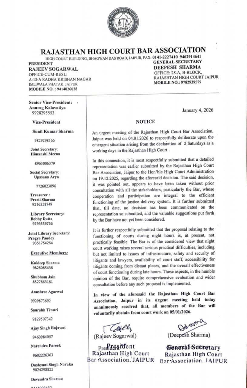 राजस्थान हाईकोर्ट बार एसोसिएशन, जयपुर ने रविवार को आयोजित आपात बैठक में सर्वसम्मति से यह निर्णय लिया कि बार के सभी सदस्य 5 जनवरी 2026 को स्वेच्छा से न्यायिक कार्य से दूर रहेंगे।