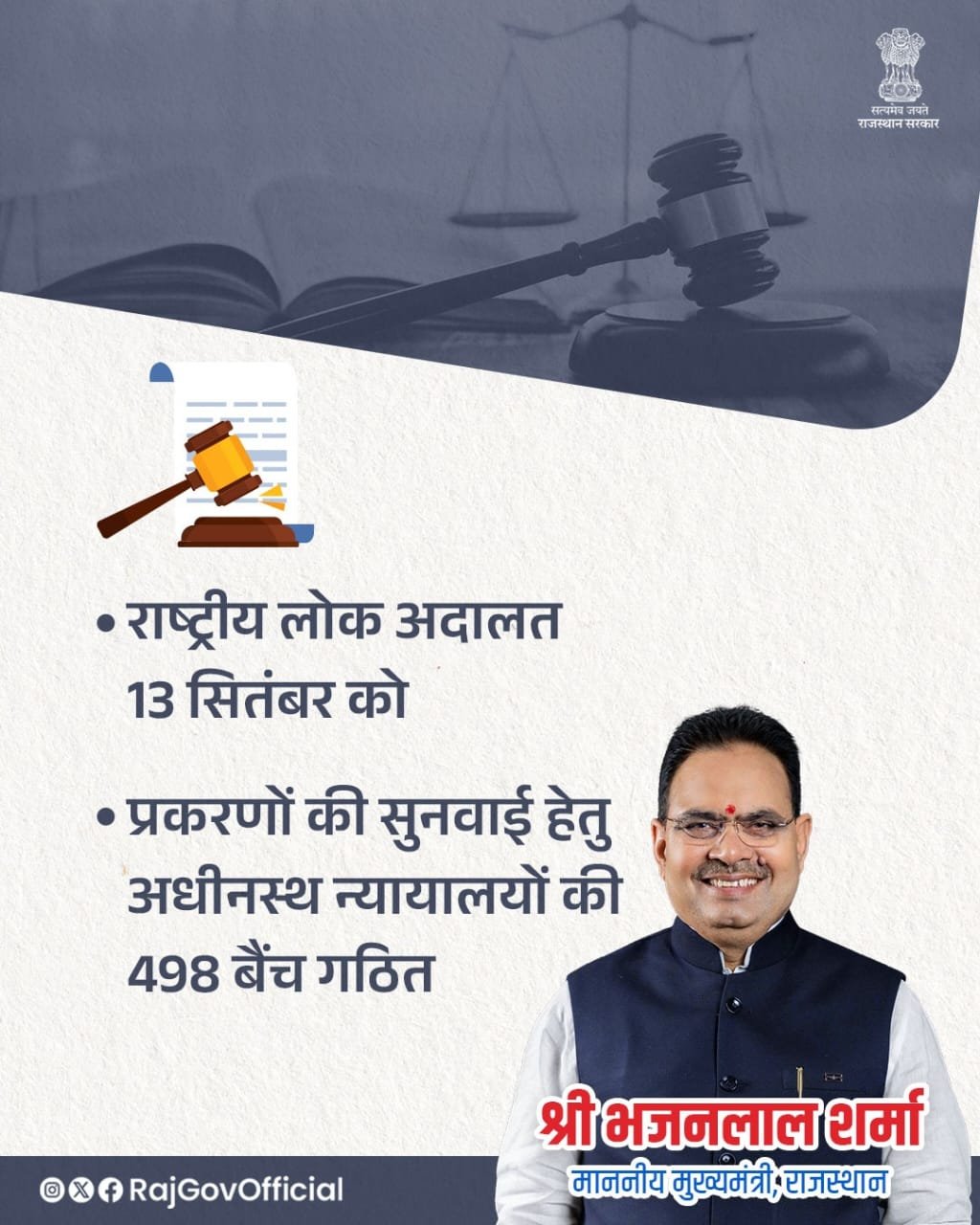 राजस्थान सरकार ने भी कल होने वाली इस राष्ट्रीय लोक अदालत के लिए मुख्यमंत्री भजनलाल शर्मा के साथ पोस्टर टवीट करते हुए राष्ट्रीय लोक अदालत की जानकारी साझा की हैं.य लोक अदालत के लिए मुख्यमंत्री भजनलाल शर्मा के साथ पोस्टर टवीट करते हुए राष्ट्रीय लोक अदालत की जानकारी साझा की हैं.