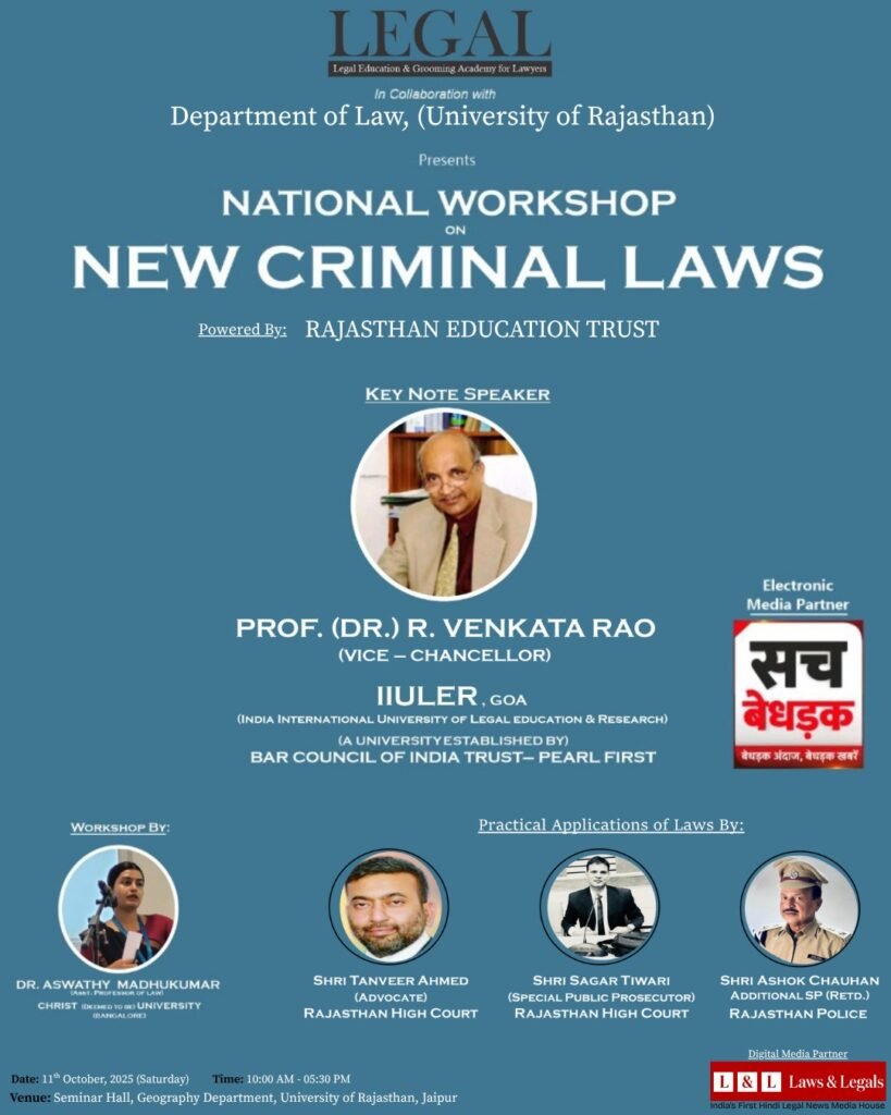 लीगल संस्थान और राजस्थान विश्वविद्यालय के विधि विभाग के संयुक्त तत्वावधान में आयोजित इस कार्यशाला का आयोजन राजस्थान विश्वविद्यालय के भूगोल विभाग के सेमिनार हॉल में होगा।
