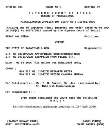 सुप्रीम कोर्ट में सूरजमल मीणा की ओर से दायर एक ताजा मिसलेनियस एप्लिकेशन में याचिकाकर्ता ने मांग की है कि 5 और 6 अप्रैल 2026 को प्रस्तावित SI/प्लाटून कमांडर भर्ती परीक्षा को कम से कम 4 सप्ताह के लिए टाल दिया जाए।