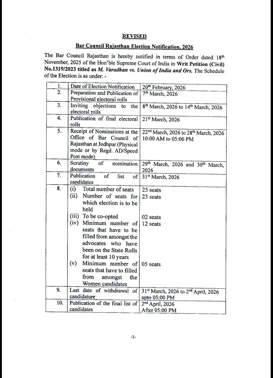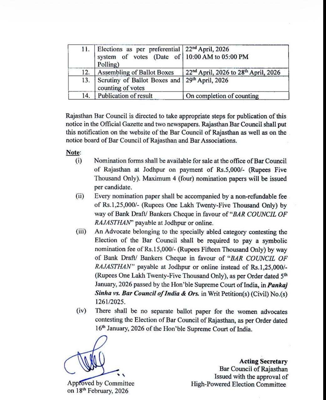 जोधपुर। राजस्थान की कानूनी दुनिया में बड़ी हलचल मचाते हुए राजस्थान बार काउंसिल की हाईपॉवर कमेटी ने वर्ष 2026 के चुनावों का संशोधित और अंतिम कार्यक्रम जारी कर दिया है।