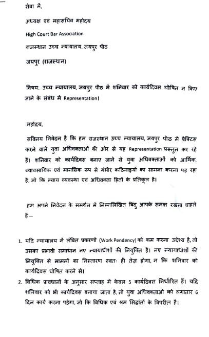 पत्र में यह भी रेखांकित किया गया है कि युवा अधिवक्ताओं के लिए शनिवार का दिन प्रशिक्षण, वरिष्ठ अधिवक्ताओं के साथ संवाद, निर्णयों के अध्ययन और कौशल-विकास के लिए अत्यंत महत्वपूर्ण होता है।