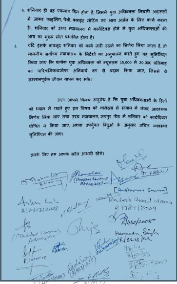 अधिवक्ताओं ने बार को सौंपे प्रतिवेदन में कहा है कि इसके बावजूद भी अगर शनिवार को कार्यदिवस घोषित किया जाता है, तो पहले युवा अधिवक्ताओं के लिए कम से कम 15 से 20 हजार रुपये का वजीफा तय किया जाए।