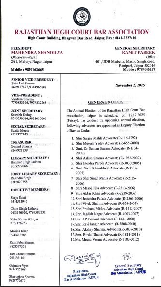राजस्थान हाईकोर्ट बार एसोसिएशन, जयपुर के वार्षिक चुनावों की तारीख घोषित कर दी गई है.