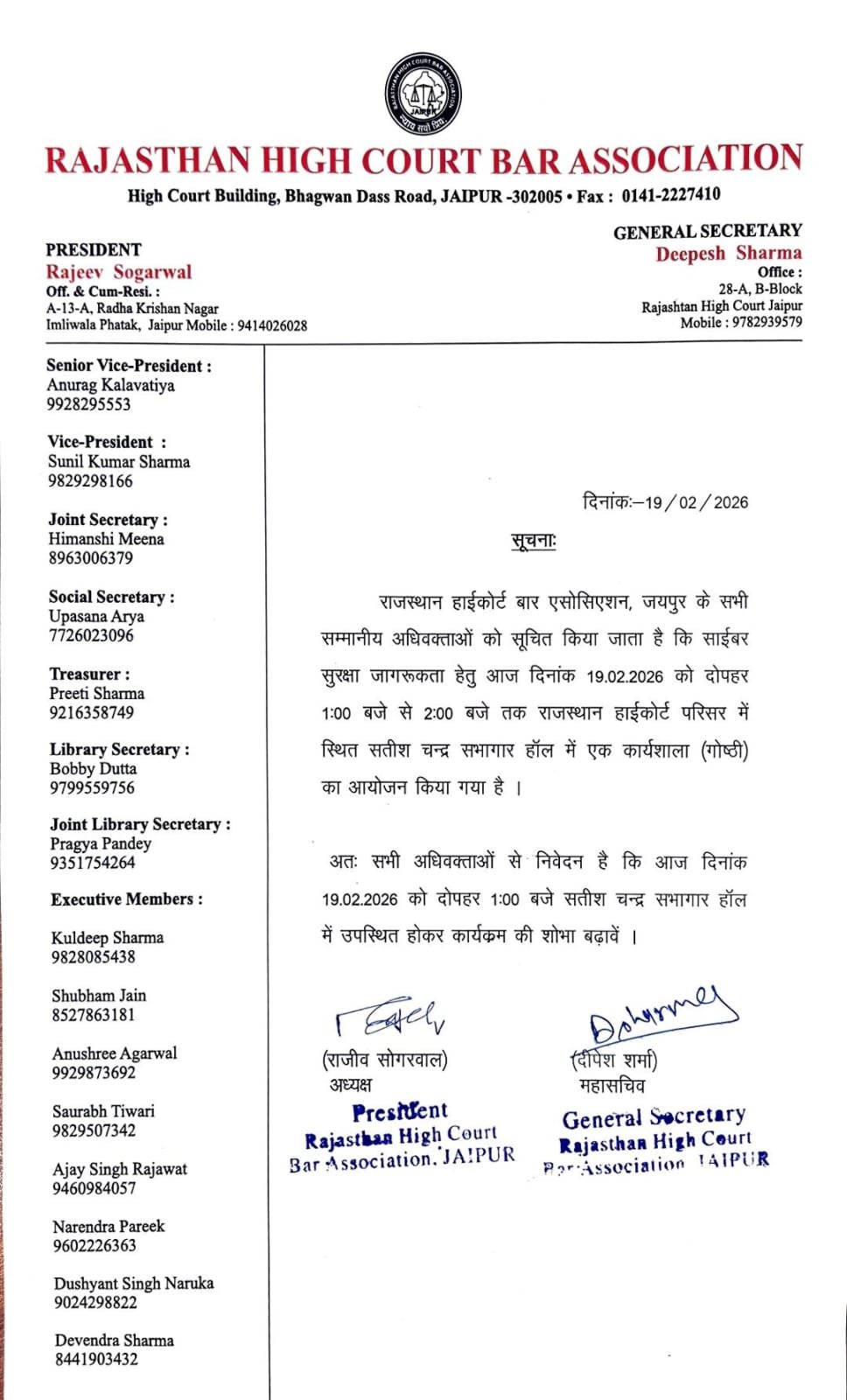 जयपुर। राजस्थान हाईकोर्ट को मिल रही बार बार बम धमकियों के बीच राजस्थान हाईकोर्ट बार एसोसिएशन जयपुर ने साइबर सुरक्षा जागरूकता को लेकर अधिवक्ताओं के लिए विशेष कार्यशाला का आयोजन करने जा रही हैं.
