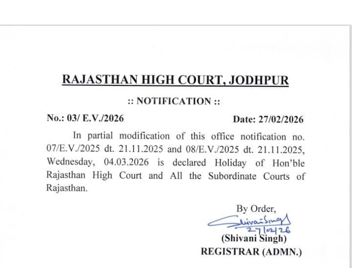 जोधपुर। राजस्थान हाईकोर्ट ने हाईकोर्ट सहित प्रदेशभर की अदालतों में 4 मार्च 2026 (बुधवार) को न्यायालय में अवकाश घोषित करने का निर्णय लिया है। यह निर्णय हाईकोर्ट बार एसोसिएशन के संयुक्त अनुरोध के बाद लिया गया।