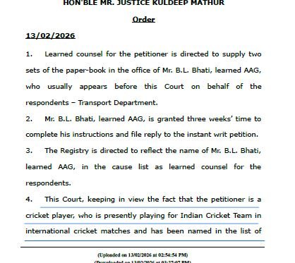 जोधपुर। राजस्थान हाईकोर्ट ने भारतीय क्रिकेट टीम के अंतरराष्ट्रीय खिलाड़ी रवि बिश्नोई को बड़ी राहत देते हुए परिवहन विभाग द्वारा जारी नोटिस की प्रभावी कार्रवाई पर अंतरिम रोक लगा दी है।