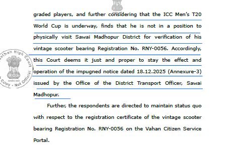 हाईकोर्ट ने यह आदेश क्रिकेट खिलाड़ी रवि विश्नोई की उस याचिका पर सुनवाई करते हुए दिया हैं जिसमें सवाई माधोपुर जिला परिवहन अधिकारी द्वारा विंटेज स्कूटर के सत्यापन से संबंधित नोटिस को चुनौती दी गई हैं.