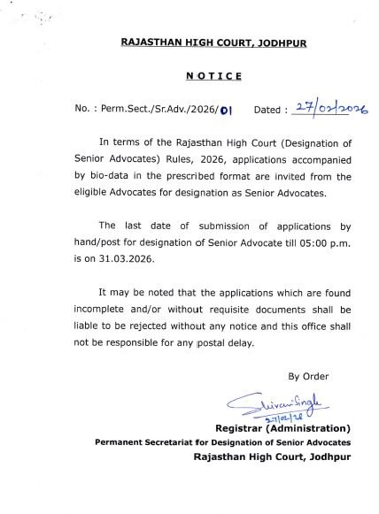 राजस्थान हाईकोर्ट (Designation of Senior Advocates) Rules, 2026 के तहत यह प्रक्रिया शुरू की गई है, जिससे राज्य के अनुभवी और योग्य अधिवक्ताओं को सीनियर एडवोकेट का दर्जा दिया जाएगा।