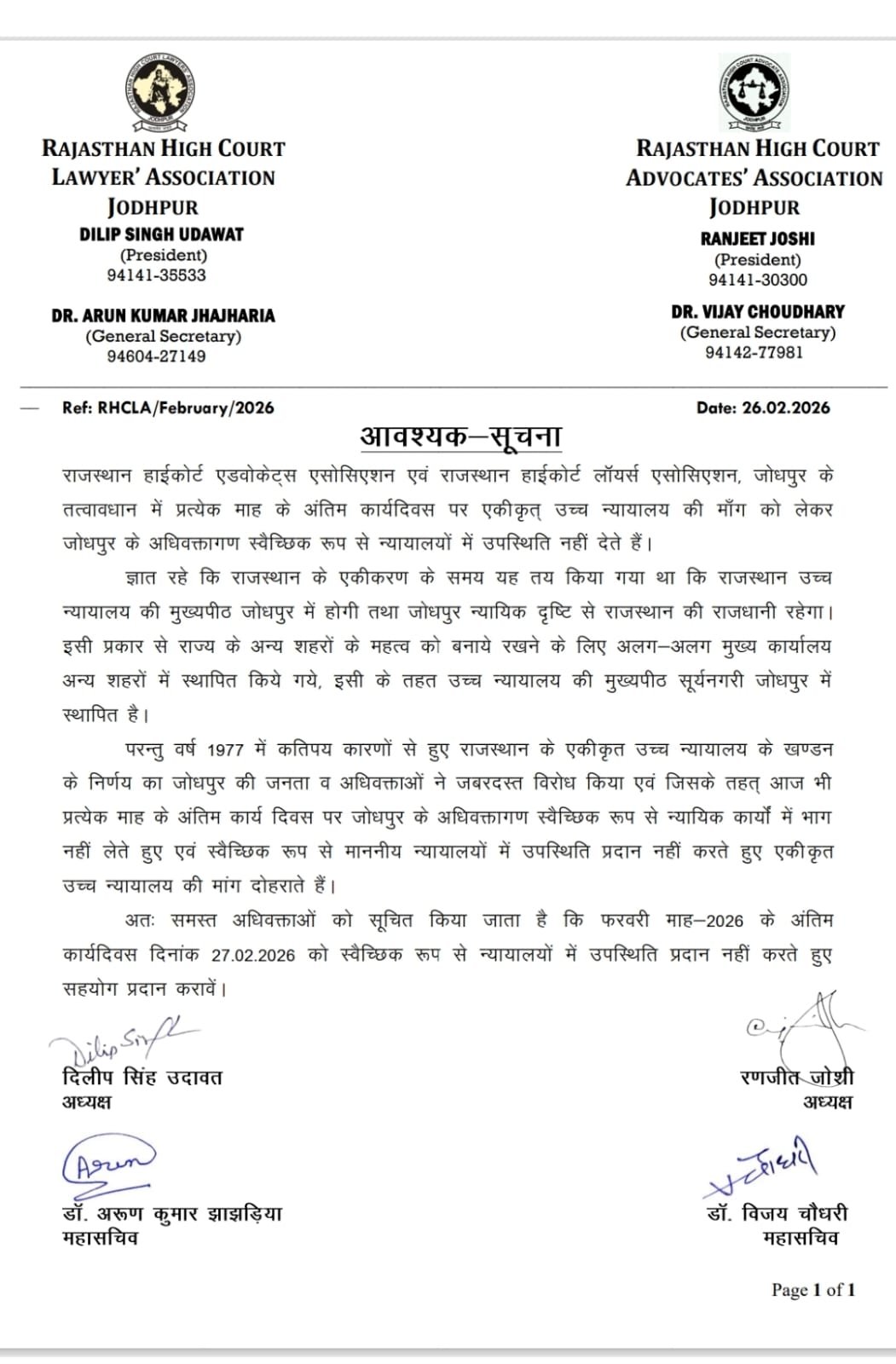 दोनों बार एसोसिएशनों के अध्यक्षों और महासचिवों द्वारा हस्ताक्षरित नोटिस में अधिवक्ताओं से अपील की गई है कि वे 27 फरवरी 2026 को अदालतों में उपस्थिति दर्ज न कराएं और आंदोलन को सफल बनाने में सहयोग दें। इसे पूर्णतः स्वैच्छिक कार्यक्रम बताया गया है।