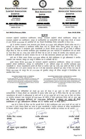 जोधपुर-जयपुर में बार एसोसिएशनों का बड़ा कदम, आगामी 7 और 21 फरवरी के शनिवार को न्यायिक कार्य बहिष्कार का ऐलान, सीजेआई को देंगे प्रतिवेदन