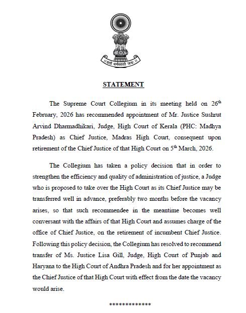 कॉलेजियम ने अपने नीतिगत निर्णय के अनुरूप पंजाब एवं हरियाणा हाईकोर्ट की जज जस्टिस लिसा गिल के आंध्र प्रदेश हाईकोर्ट में तबादले की भी सिफारिश की है। साथ ही, उन्हें आंध्र प्रदेश हाईकोर्ट का मुख्य न्यायाधीश नियुक्त करने की अनुशंसा की गई है, जो संबंधित पद रिक्त होने की तिथि से प्रभावी होगी।
