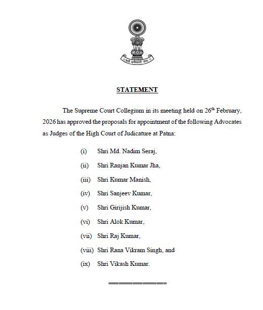 कॉलेजियम ने 26 फरवरी को हुई बैठक में ही पटना हाईकोर्ट के लिए नौ अधिवक्ताओं के नामों को न्यायाधीश के रूप में नियुक्त करने के प्रस्ताव को स्वीकृति दी गई।