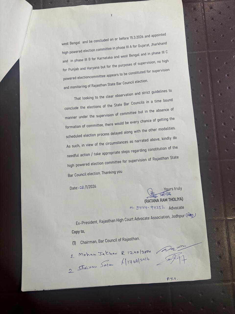 सैकड़ो अधिवक्ताओं के हस्ताक्षर के साथ वरिष्ठ अधिवक्ता एवं राजस्थान हाईकोर्ट अधिवक्ता संघ, जोधपुर के पूर्व अध्यक्ष रतनाराम ठोलिया ने Bar Council of India के चेयरमैन को पत्र लिखकर राजस्थान राज्य बार काउंसिल चुनाव की निगरानी के लिए हाई-पावर्ड इलेक्शन कमेटी के गठन की मांग की है।
